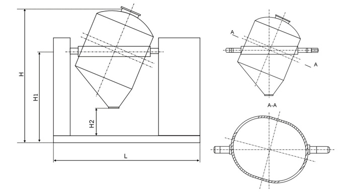 采用桶體的重心偏心、軸向偏心、上下偏心的三偏心原理以及六向不對(duì)稱的設(shè)計(jì)方式:上下角度容積不對(duì)稱、左右角度容積不對(duì)稱、前后角度容積不對(duì)稱。按照該設(shè)計(jì)原理所產(chǎn)生的單面不同容積多向錯(cuò)位交叉運(yùn)動(dòng),以達(dá)到最佳的物料混合效果。