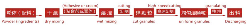 粉料在錐柱體容器內(nèi),經(jīng)底部攬拌器充分?jǐn)嚢?,同時(shí)通過壓力噴淋粘合劑(或則膏體),使物料混合成濕潤碎狀軟材,然后再經(jīng)側(cè)置的高速制粒刀切割成均勻的濕顆粒,出料同時(shí)經(jīng)整 粒機(jī)再次的整粒作用,控制顆粒目數(shù),以達(dá)到各種顆粒的要求。
