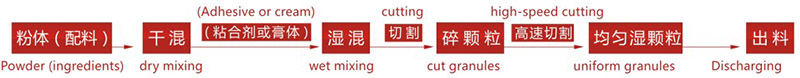 粉料在錐柱體容器內(nèi),經(jīng)底部攪拌器充分?jǐn)嚢?,同時(shí)通過(guò)壓力噴淋粘合劑(或則裔體),使 物料混合成濕潤(rùn)碎狀軟材,然后再經(jīng)側(cè)置的高速制粒刀切割成均勻的濕顆粒,以達(dá)到各種顆 粒的要求。