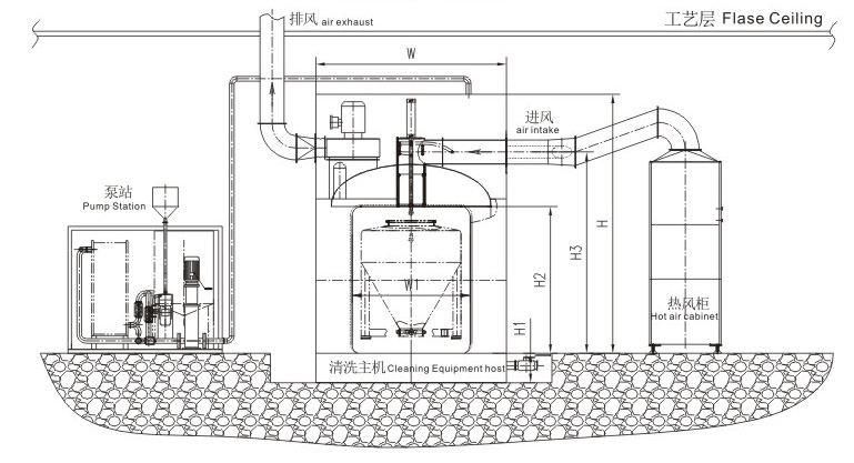 該機有清洗室、泵站、空氣處理單元、控制系統(tǒng)等 組成。